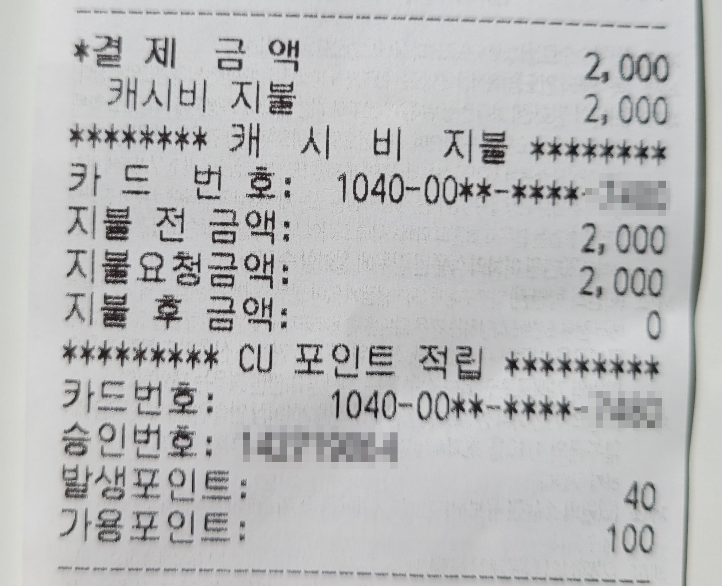 CU캐시비 카드로 2,000원 결제시 40점이 적립된다. 20점/4000원이니 1%적립이 아니라 2%적립이 된다.